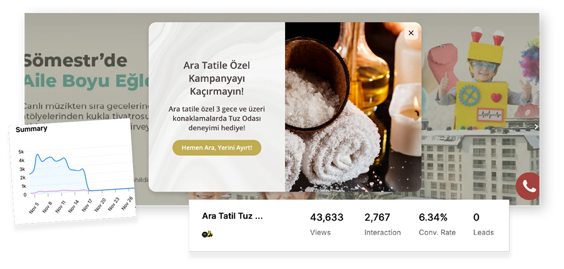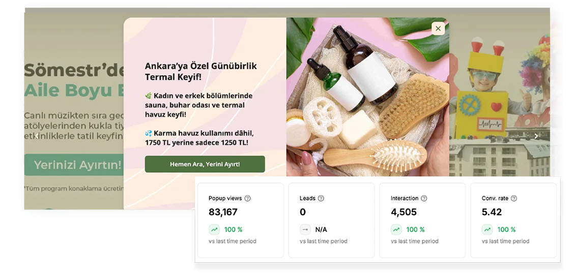 • Lokasyona veya kullanıcı davranışına göre kurgulanan popup'larla rezervasyon yönlendirmesini güçlendirdik.