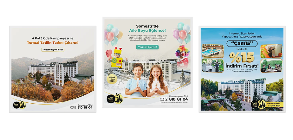 Çam Hotel ile birlikte yürüttüğümüz dijital reklam kurgularıyla doğru kullanıcıyı doğru anda yakalamayı ve dönüşüm oranlarını artırmayı hedefledik. Reklam bütçesini daha verimli kullanarak rekabetin yüksek olduğu termal ve muhafazakar otel pazarında öne çıkmasını sağladık.
